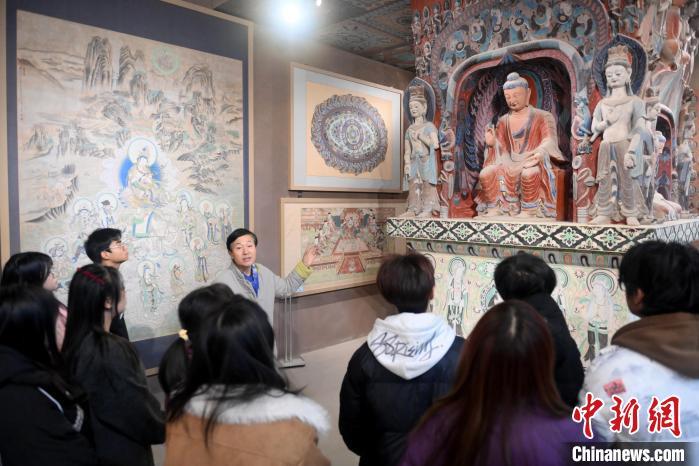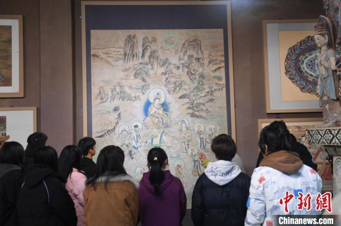 1月14日,甘肅省酒泉市,甘肅酒泉職業技術學院非物質文化遺產敦煌彩塑技藝傳習所內,學生們參觀敦煌壁畫作品。中新社記者 李亞龍 攝
