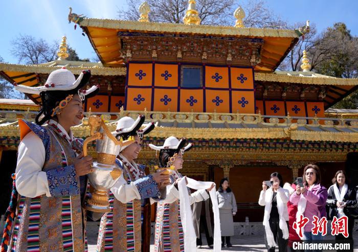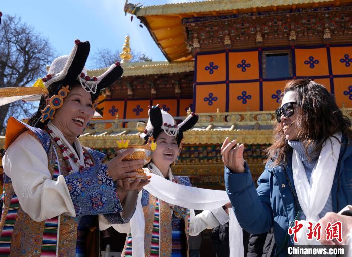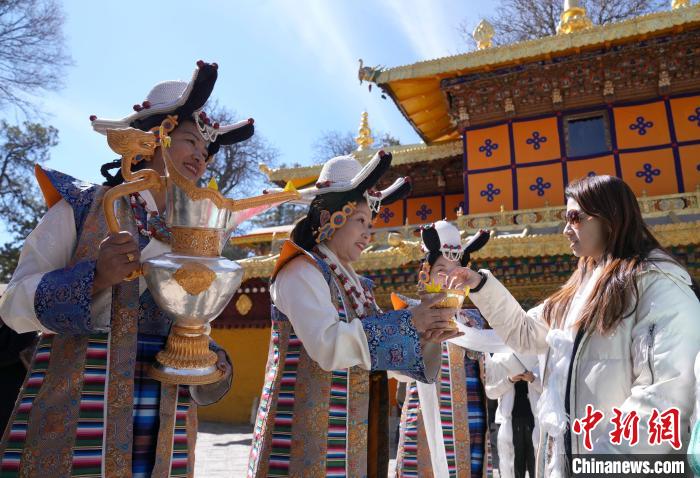 2月20日,由西藏自治區文化和旅游廳舉辦的2025年香港至拉薩航班首航旅行團歡迎儀式在羅布林卡舉行。來自香港的游客將前往布達拉宮、大昭寺等地,開啟冬游西藏旅途。2月19日,拉薩至香港的首條地區航線正式開通。航線的開通,更加便捷了兩地居民的出行,也將進一步促進兩地在旅游、文化、經貿等領域的交流與合作。圖為歡迎儀式現場,工作人員向香港游客敬獻青稞酒。中新社記者 李林 攝