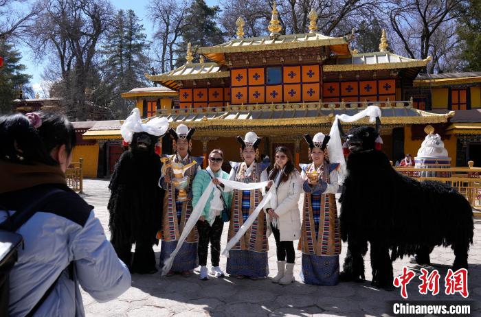 圖為歡迎儀式現場,香港游客在羅布林卡與身著拉薩傳統服飾的工作人員合影留念。中新社記者 李林 攝