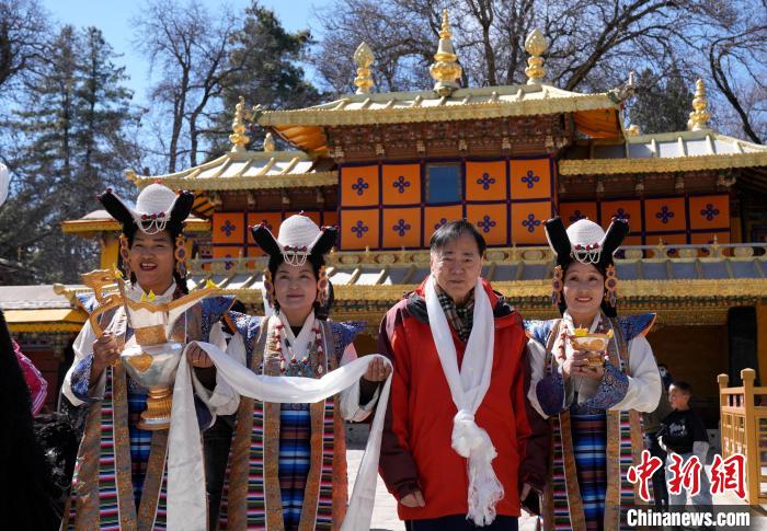 圖為歡迎儀式現場,香港游客在羅布林卡與工作人員合影留念。中新社記者 李林 攝