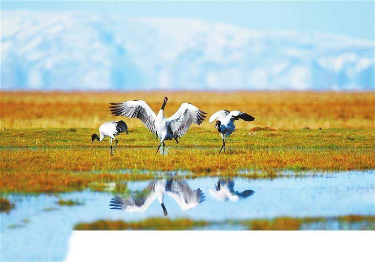 尕海(hai)湖(hu)的晨霧(wu)尚未散盡,黑頸鶴的赤紅色頭(tou)頂已經開始閃現。它們(men)在苔草(cao)間跳起(qi)求偶(ou)之舞,頭(tou)頂的朱紅隨舞步明滅,如同螢火蟲的閃光(guang)。新孵化的雛鶴,棕黃(huang)色絨(rong)羽間染著乳白,是大地贈予新生命(ming)的第(di)一抹色彩。這(zhe)種國(guo)家一級保護動物蹣跚學(xue)步時(shi),總被親鳥用(yong)長喙(hui)輕推,這(zhe)場景(jing)會令保護區巡護員想起(qi)女兒(er)初學(xue)自行車(che)時(shi)自己的緊(jin)張(zhang)。