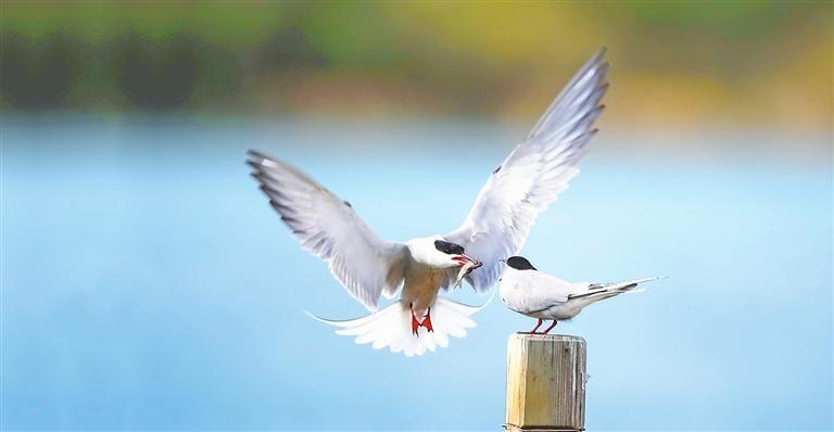 敏捷的普通燕(yan)鷗在洲灘養足了(le)精(jing)神(shen),當(dang)它(ta)的雪(xue)白翼尖剪開霧幕時,巢卵正藏在浮(fu)筏水草(cao)的根部(bu)。雛鳥(niao)破殼時頭頂戴著略(lve)染橘紅的胎帽,像是自然(ran)為新生者(zhe)加冕(mian)。不論(lun)是饑(ji)腸(chang)轆轆還是飽食(shi)小(xiao)魚,它(ta)的叫(jiao)聲總是尖銳清脆,猶如冰裂,與尕(ga)海湖(hu)的水聲交織成夏日搖(yao)籃曲。