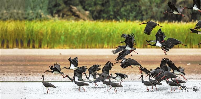 九月的(de)(de)黑(hei)河濕地,蘆(lu)葦(wei)蕩在秋陽下(xia)(xia)鍍成金箔,黑(hei)鸛群(qun)如(ru)流動的(de)(de)墨(mo)(mo)玉(yu)鑲(xiang)嵌其中。這(zhe)種(zhong)因其配色和珍(zhen)稀(xi)程度(du)被稱為“鳥中熊貓”的(de)(de)珍(zhen)禽,是出色的(de)(de)捕魚能手。隨著它精準(zhun)鎖定水下(xia)(xia)獵物,赤紅(hong)色長喙掠過(guo)水面,黑(hei)、白、紅(hong)的(de)(de)絕(jue)色搭配如(ru)同流動的(de)(de)墨(mo)(mo)畫。中國最大(da)的(de)(de)黑(hei)鸛種(zhong)群(qun)——600余只在此(ci)集(ji)結,夜棲時(shi)其倒影連成一(yi)線(xian),讓觀鳥者想起傳(chuan)世的(de)(de)水墨(mo)(mo)長卷(juan)。