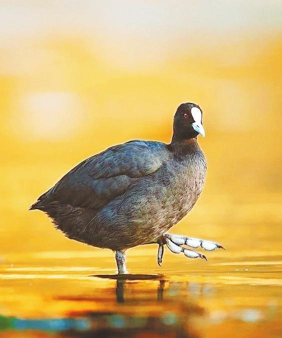 白骨頂(ding)(ding)又(you)被(bei)喚(huan)作骨頂(ding)(ding)雞,卻是鶴(he)類的遠親。它靜浮水面時(shi)(shi),額(e)前一抹象牙白,宛若遺落(luo)人間的墨玉鎮紙。這枚額(e)甲實(shi)為特化的角(jiao)質層,是為了(le)保護頭(tou)部的盔胄。灰白色的瓣蹼(pu)如雪(xue)地(di)靴般包裹趾間,劃開水藻(zao)時(shi)(shi)泛(fan)起粼粼波光——這身黑羽配雪(xue)蹼(pu)的穿搭,竟比時(shi)(shi)裝周的極簡(jian)主義(yi)更先(xian)鋒。當它們列隊(dui)掠過蘆(lu)葦蕩(dang),水淼勾勒的剪影里,仿佛在繪(hui)制著秋天(tian)的信箋。