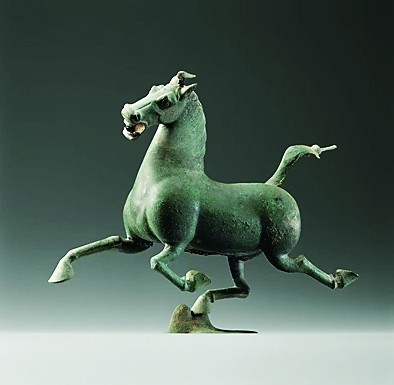 走進甘肅省博(bo)物館,這(zhe)匹東漢神駒,仿佛正在飛馳,攫(jue)住了所有人(ren)的(de)目光——它全(quan)身呈流線型,肌肉(rou)健(jian)碩有力(li)。它的(de)口、眼(yan)、鼻(bi)均張(zhang)開,三足騰空(kong)而起,一足踏于飛鳥(niao)(niao)之上,在飛鳥(niao)(niao)回首驚顧(gu)的(de)一剎那,它已超越流星般飛行(xing)的(de)鳥(niao)(niao)向前(qian)而去。馬的(de)奔騰嘶鳴和風(feng)的(de)呼嘯猶在耳畔,這(zhe)個(ge)風(feng)馳電掣的(de)瞬間(jian)也被定(ding)格成永恒。