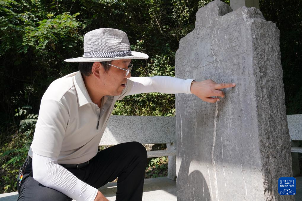 7月(yue)14日(ri),在(zai)青泥嶺上,徽縣博(bo)物館文博(bo)副研究館員(yuan)曹鵬雁在(zai)介紹一塊刻(ke)有“遠(yuan)通吳(wu)楚(chu)”字(zi)樣的清代(dai)石碑(bei)。新華(hua)社記者(zhe) 馬寧 攝(she)