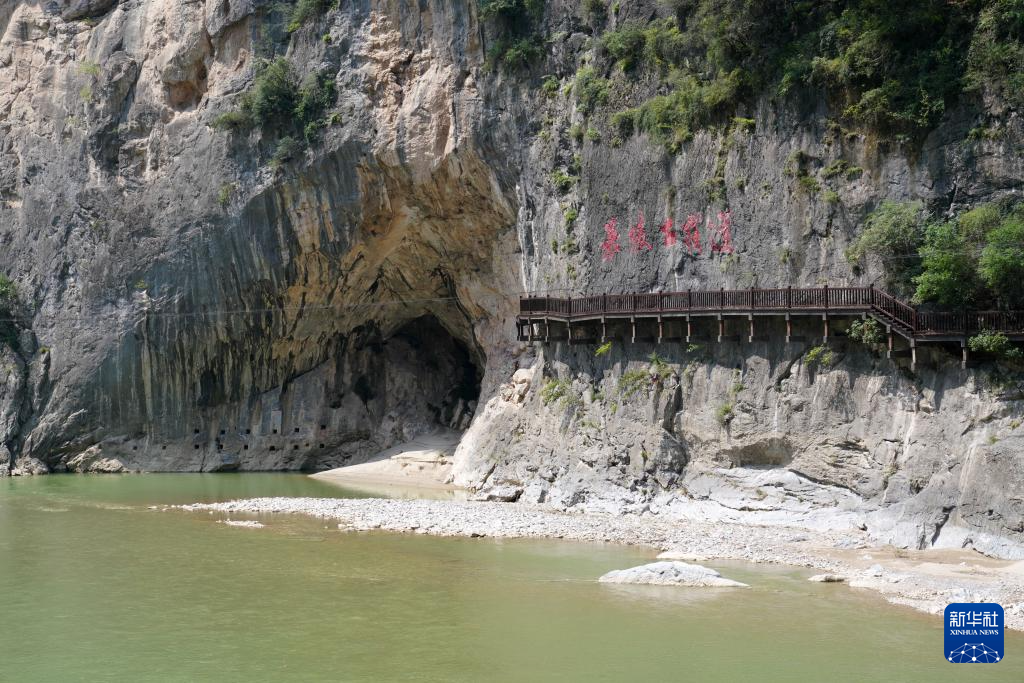7月15日拍攝(she)的青泥嶺下嘉(jia)陵古(gu)棧道(dao)(dao)的棧道(dao)(dao)孔遺存和復原的棧道(dao)(dao)。新華社記者 馬寧 攝(she)