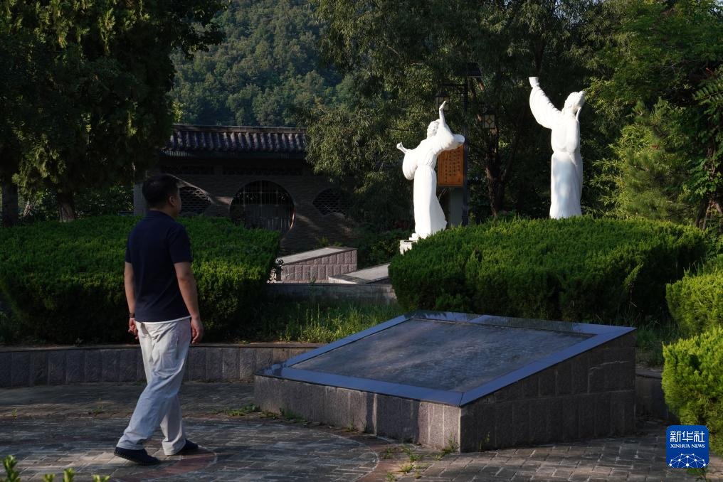 7月14日,在甘(gan)肅省隴(long)南市(shi)徽縣大河店鎮青泥村(cun),游客觀賞李白和杜甫的雕塑。新華社記者 馬(ma)寧(ning) 攝