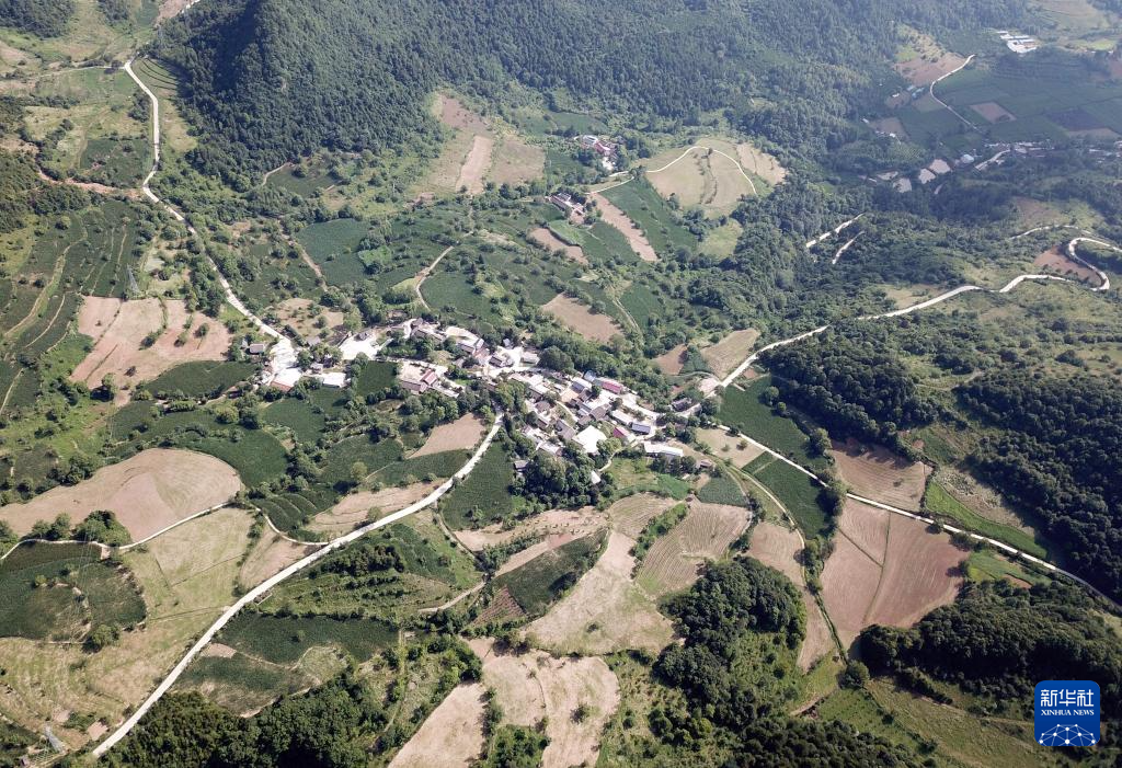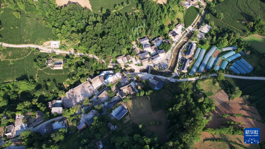 7月14日(ri)拍攝的青泥嶺上(shang)的村(cun)莊和鄉村(cun)道路(lu)(無人機照片(pian))。新華社(she)記者(zhe) 馬寧 攝
