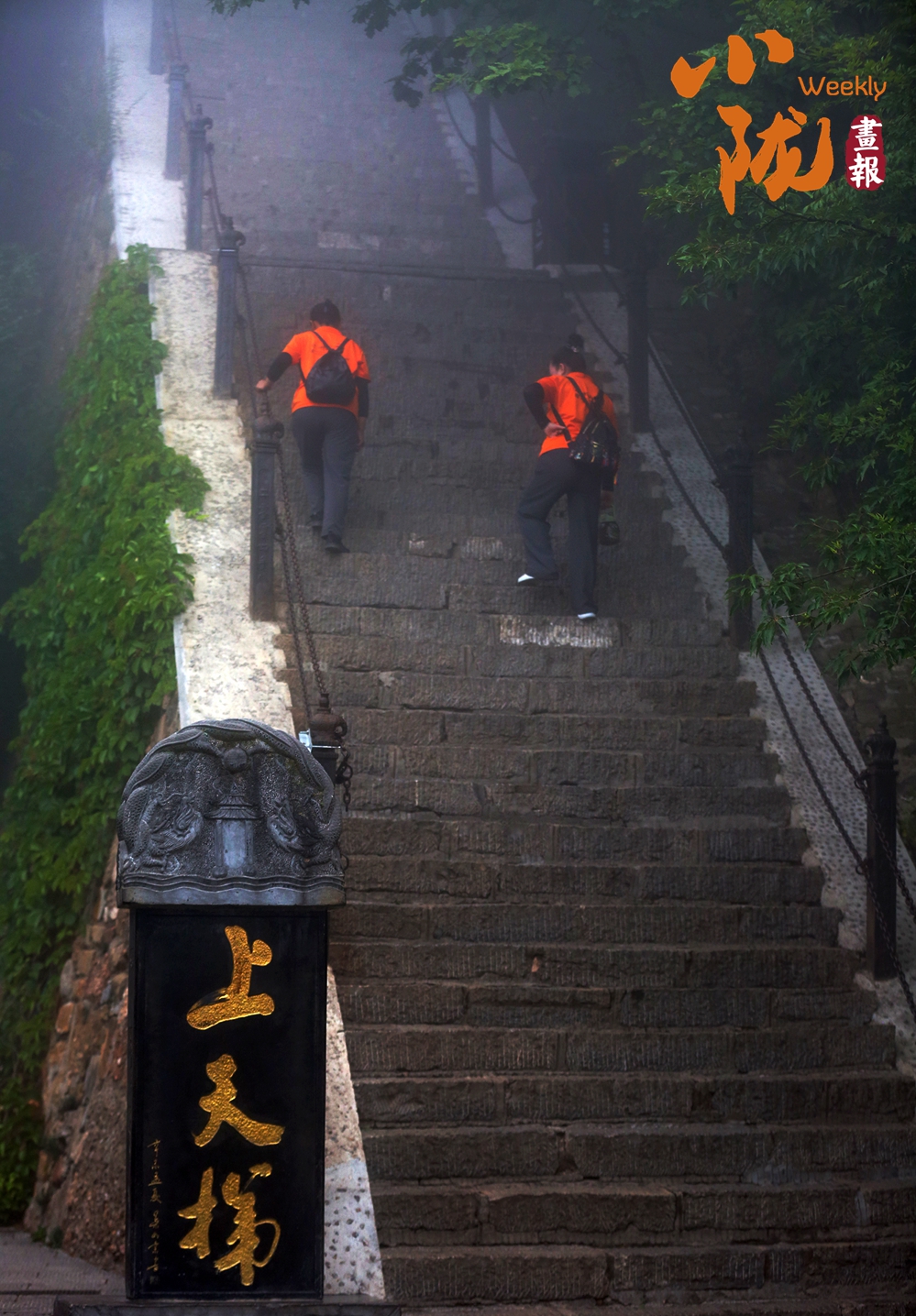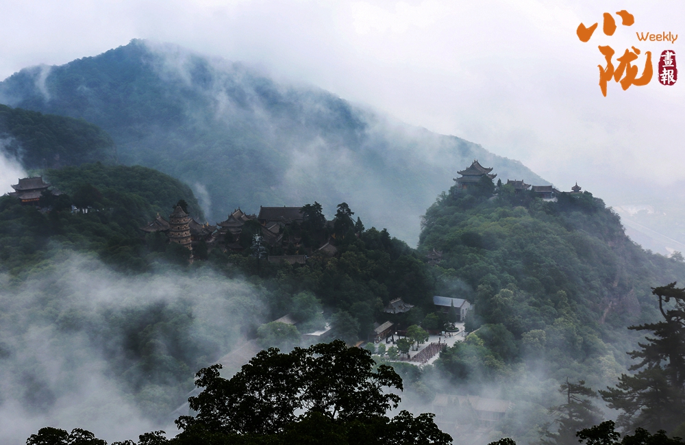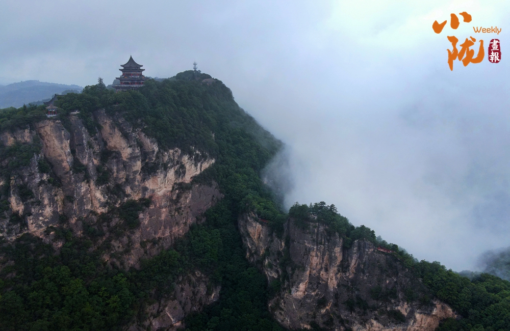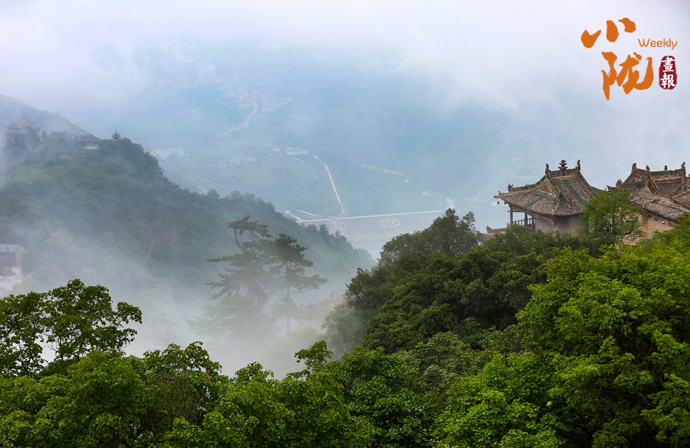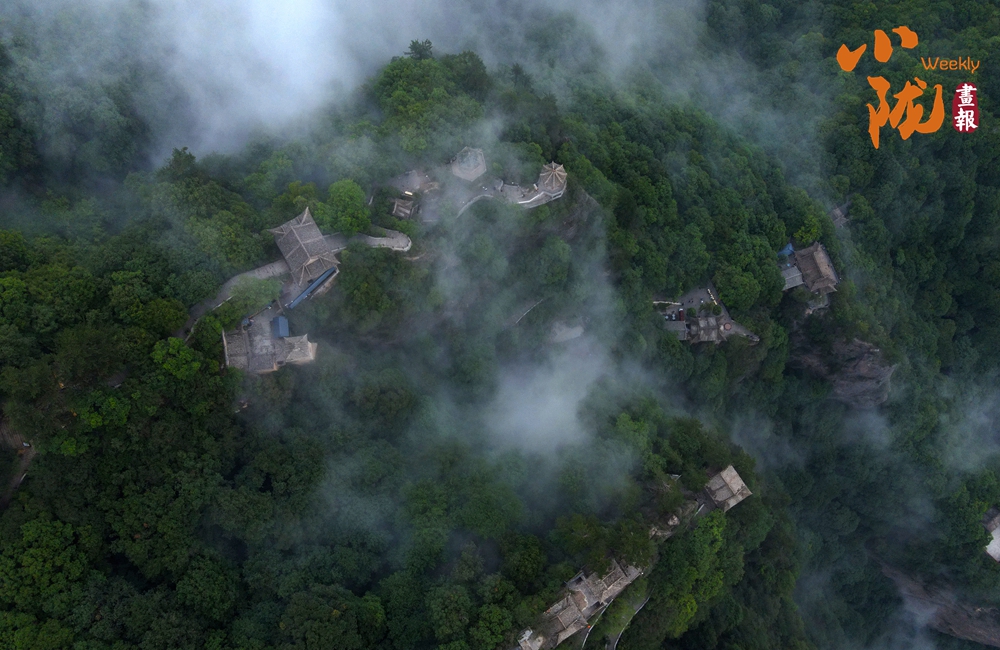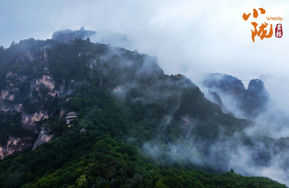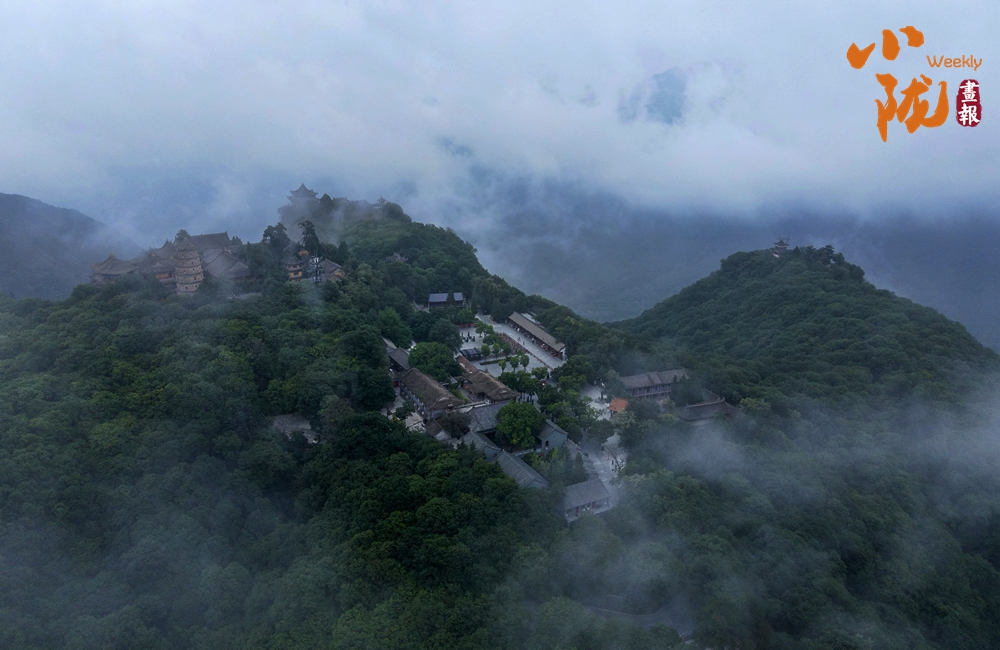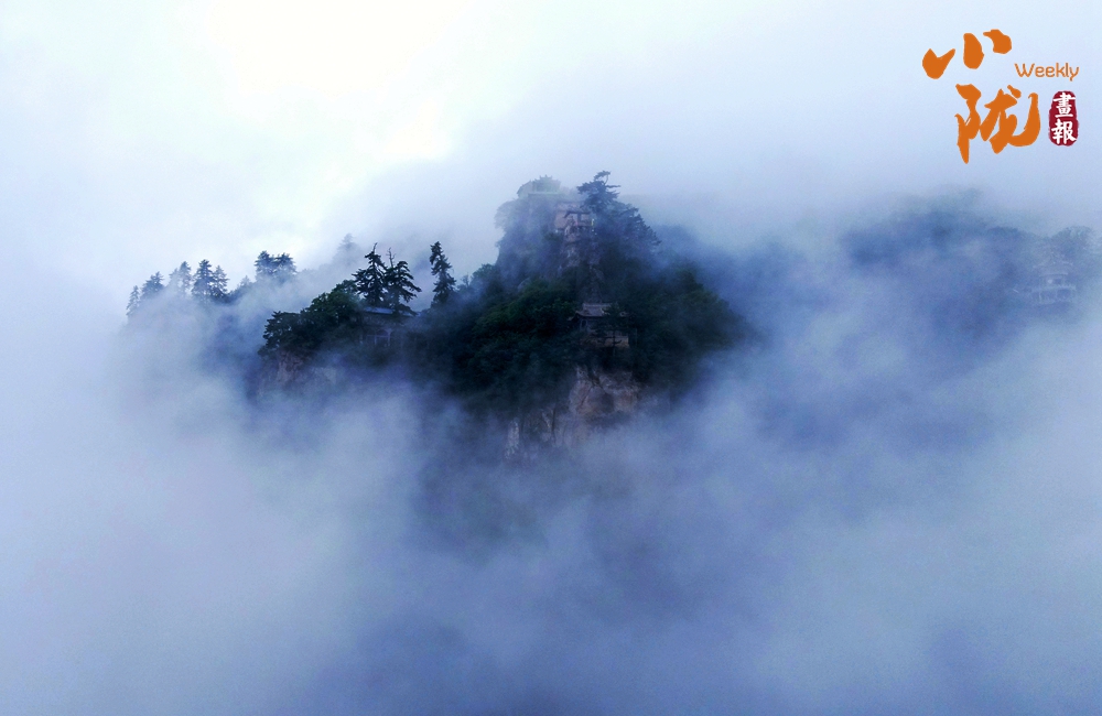 云霧繚繞,山水與(yu)寺廟隱現,營(ying)造出神秘(mi)且(qie)令人向(xiang)往的視覺效果。站在半山腰,背靠懸崖(ya),深邃不可見底,不禁生(sheng)出“山登絕頂我為峰”的豪情。然而,世間萬物,瞬息萬變,是否成為峰巔之(zhi)巔又何妨?